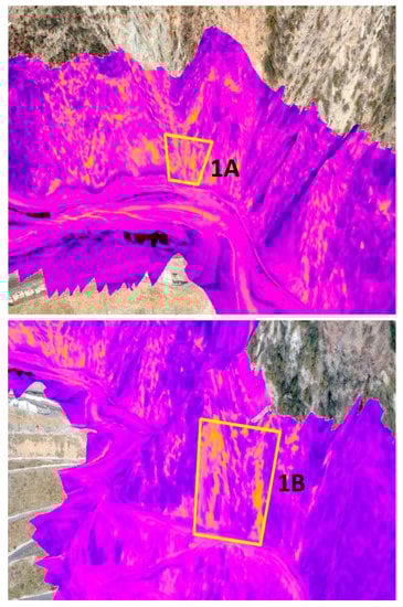 Three-dimensional mosaic images of some areas of the landfill (Mount Scarpino); zones with marked thermal anomalies (1A and 1B) are highlighted.