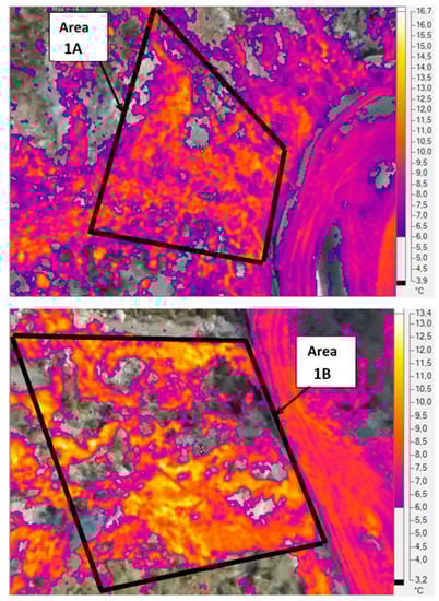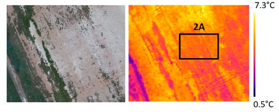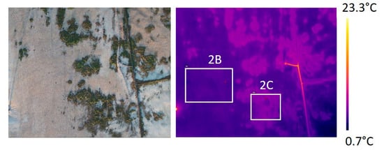 Individual visible and thermal images acquired by the UAV over specific areas during the winter season are shown in Figure 8 and Figure 9. Figure 8 refers to a central area of the landfill, already buried, in which only flat bare soil and low vegetation were present. The left-hand side of the figure shows the visible (RGB) image of the inspected site, while on the right-hand side the corresponding thermal (IR) image is reported. Processing thermal data over portions of soil surface having a homogenous structure (as inferred by the visible image) gave a mean value and excursion of surface temperature not significantly far from those recorded for the “undisturbed” soil. For instance, the area framed inside the rectangle (termed 2A) of Figure 8 (right-hand) is characterised by calculated minimum, maximum, and average temperatures of 3.1 °C, 6 °C, and 4.4 °C, respectively. It is conjectured that in homogeneous zones of the inspected landfill the soil temperature does not vary significantly with respect to the background value.