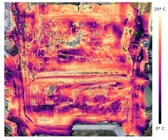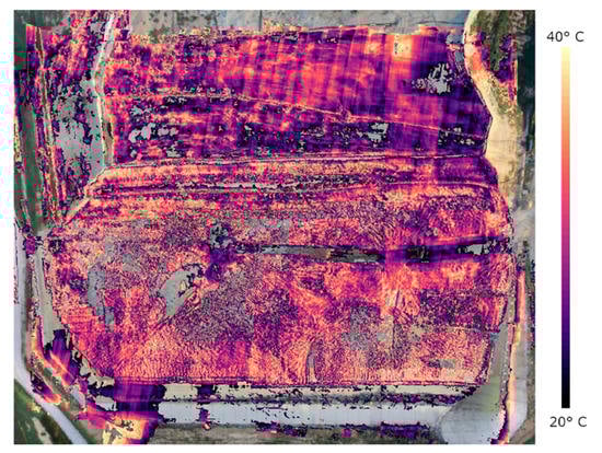 The thermal ortho-mosaic images of Scala Erre landfill area are shown in Figure 6 for the summer survey (July 2019) and Figure 7 for the winter survey (February 2020). A visual inspection of images at a glance shows more evident soil temperature gradients during the winter survey, when the soil-to-ambient temperature difference is higher. However, since the landfill terrain was not homogeneous, different types of ground material may appear as anomalies in thermal images without a clear connection to landfill gas leakage. In fact, the site encompasses areas with bare soil, vegetation, plastic liners, pipes, etc. that are expected to have different emissivity and, therefore, to produce false temperature anomalies in thermal infrared images. For this reason, attention has been focused on smaller areas of the landfill where the potential occurrence of a thermal anomaly associated with a biogas emission could be more likely, i.e., areas with homogeneous soil or uniform vegetation, or far from pipes carrying hot biogas.