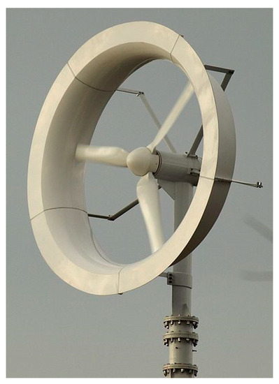 According to the definition in 2-61400-IEC, wind turbines with a rotor swept area less than 200 m2 and a production capacity of about 50 kW are defined as small wind turbines [36]. According to the definition, the wind lens turbine is a kind of turbine surrounded by a brim or lens, making it more efficient [37]. A wind lens turbine is shown in Figure 2.