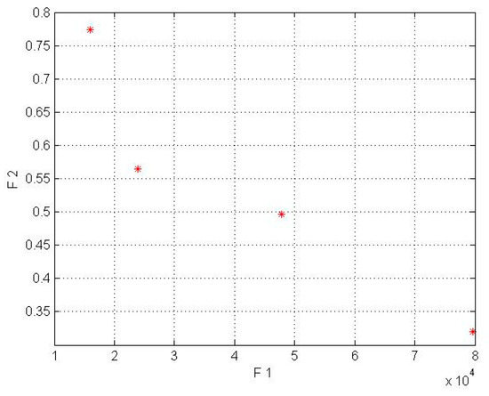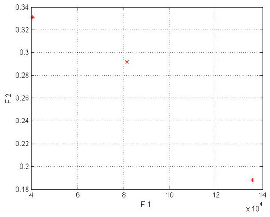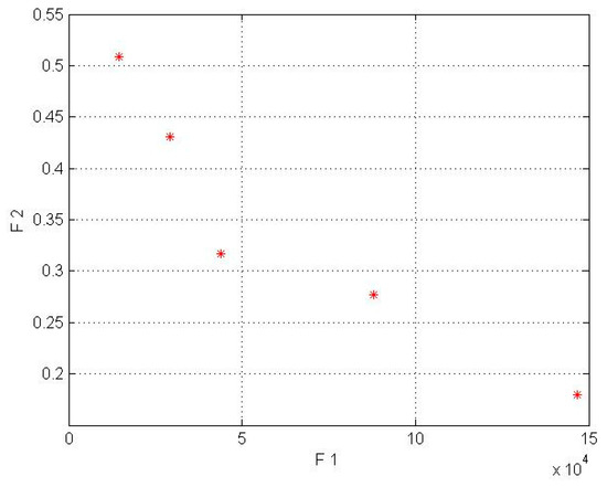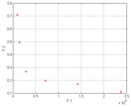 In this model for a wind lens turbine, the input parameters for the first objective function are shown in Table 2, and the input parameters for the second objective function were obtained from the mathematical equations based on Fingersh’s work [43]. Additionally, it should be mentioned that the population size parameter (in NSGA-II code) was implemented in 4 different sizes (npop = 5, 7, 8, 10). In the wind lens turbine, npop = 7 for the Kish Island station and npop = 8 for the Firoozkooh station had optimum performance. NSGA-II was run on MATLAB software, and the runtime processes for Kish Island and Firoozkooh were 3.92 and 6.23 s, respectively. The output of the algorithm is shown in Table 6 and Table 7and in Figure 5 and Figure 6.
