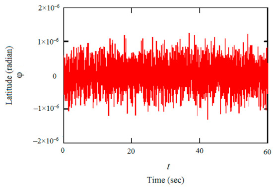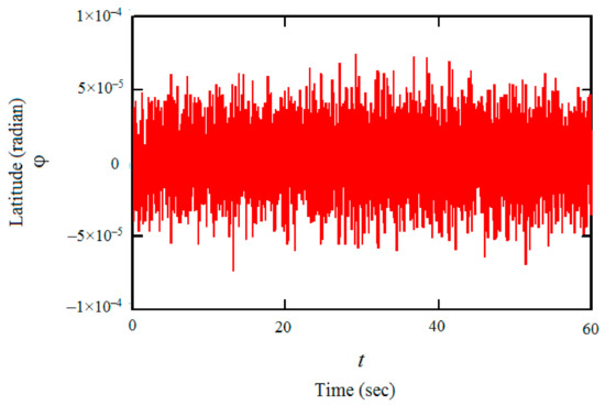 Next, we consider that the beginning coordinates of the object’s trajectory are defined as φ0 = 0.8 rad, λ0 = 0.3 rad, time interval of movement (0; 1000) s; the object moves at a constant velocity V = 20 m s−1 along a loxodromic trajectory with an azimuthal angle at a constant speed along a loxodromic trajectory with an azimuthal angle A = 0.2 rad. In the process of movement, the topography of the Earth’s surface leads to a random change in the height of the object with zero expectation and standard deviation of 0.15 m. Based on the nature of the object’s trajectory, the projections of its linear velocity on the GSC-axes can be determined as follows: