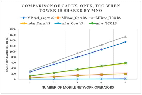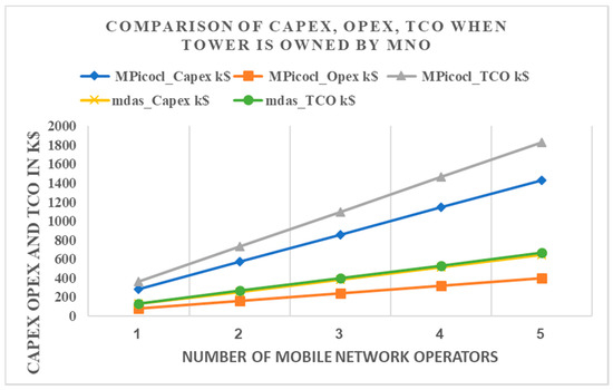 Sensitivity analysis of Capex, Opex and TCO for MPICOC and MDAS when mobile network operator (MNO) owns the tower.