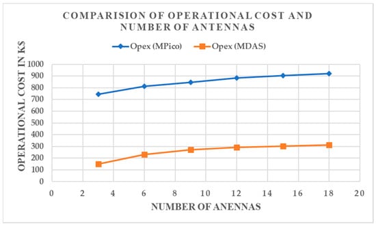 Sensitivity analysis on Opex for MPICOC and MDAS with the number of antennas.