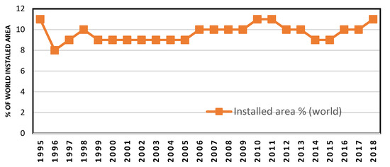 Morocco’s share of installed solar thermal capacity is low but remained stable for three decades as showed in Figure 2, around 0.10%. This means that the growth in m2 installed in Morocco has been parallel to the world trend [41].