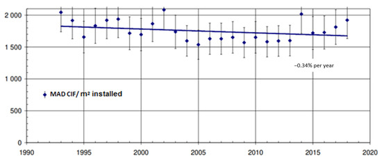 On a 30-year scale, Figure 3 shows that: prices in Dh/m2, cost insurance and freight (CIF, blue diamonds in Figure 3), fluctuated by 15% (vertical blue bars in Figure 3) around a prolonged decrease of nearly 0.34% per year (decreasing blue curve in Figure 3). Solar thermal is no longer in the maturation phase and no longer undergoes a “learning curve.” Thus, prices would have lost only 5 to 6% in 30 years, which is low but appreciable considering inflation and increased purchasing power. The thermal energy produced by solar collectors has always been more profitable than that produced by grid electricity. Even very modest, this drop in prices combined with the rise in electricity prices has made this profitability even more attractive. Although “fair play,” this competitiveness goes unnoticed because of the formidable competitor of thermal energy produced by butane gas, which is heavily subsidized. Indeed, the withdrawal of the compensation 12 kg bottle would place its price around 120–140 MAD (Moroccan dirham) and not 40 MAD. Because of this, in Morocco, a solar water heater depreciates in 10 years against its butane gas competitor, regardless of the advantages related to comfort and safety of use.
