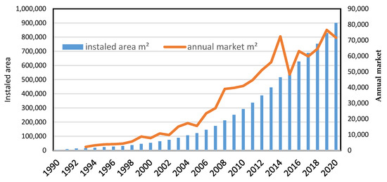 Evolution of the solar thermal collector’s cumulative area installed annually in Morocco vs. the national market (imported: installed and not installed).