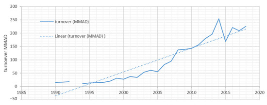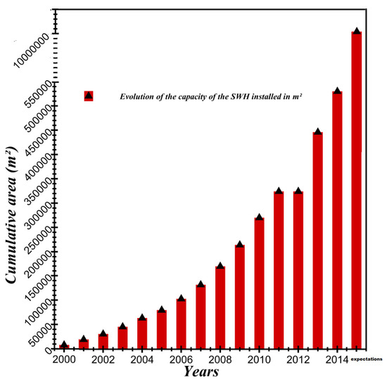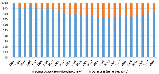 Domestic Solar water heaters (DSWH) have always dominated the sales of the market as described in Figure 4, making a significant turnover presented in Figure 5. As showed in Figure 6 they tend to dominate it more and more to exceed 80% after having fallen around 75% in the middle of the decade 2000–2010, probably under the PROMASOL Program’s impetus, which was led by AMEE (Agency for Control and Energy Efficiency).