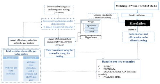 The assessment is believed to be sufficiently accurate as it follows a rational methodology for quantifying the full-scale economic impact of generalizing these solar systems. First of all, it was necessary to evaluate the number of capita per climatic zone, this parameter is not yet available, it is available only in a regional database according to the High Commission of Plans. Therefore, it was essential to convert the available regional data to comply with the climatic zoning. A schematic diagram of the followed methodology is shown in Figure 7.