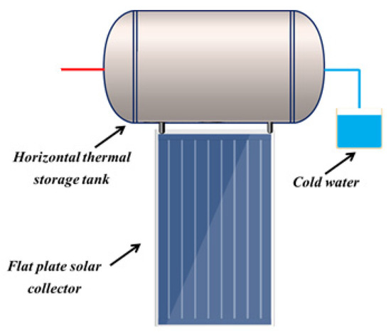 The TSWH consists of a flat plate collector (FPC) connected to an auxiliary heater integrated inside a horizontal tank as presented in Figure 8. For this system, water flows through the system when warm water rises as cooler water sinks without the need for a circulation pump. The FPC collector is installed below the storage tank so that warm water will rise into the tank by the thermosiphon effect, its principle operates on the heated water’s characteristic, which becomes lighter than the cold water, ascends to the horizontal tank, replaces the cold water, which, heavier, descends downwards and passes through the solar panel.