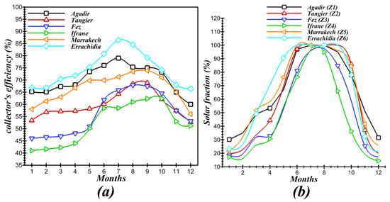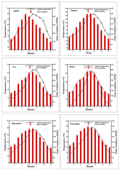 Because the Moroccan climate exhibits a great variability according to the geographical zone, it was necessary to perform a segmentation of the whole territory into areas with similar overall meteorological specifications. Accordingly, the Moroccan Agency of Energy Efficiency (AMEE) [44], proposed a climatic fragmentation of Morocco according to six climates, each climate is evidenced by a representative city. Table 2 shows general information about these zones. In addition, the main meteorological data (i.e., monthly average ambient temperature and solar irradiations) affecting the energetic performance of TSWHs is displayed in Figure 9. One can observe that the climate presents a remarkable variety which is expected to influence greatly the overall thermal behavior and performance of TSWHs.