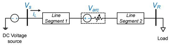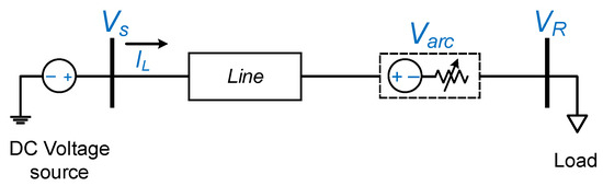 Simplified circuit representation of a dc line in the presence of a series arc fault.