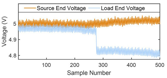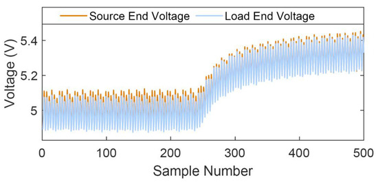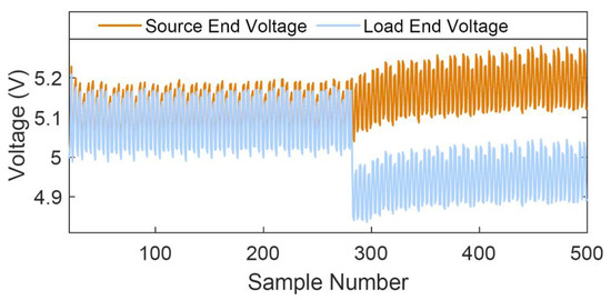 This subsection demonstrates the function of the approach for a load change event that may cause the voltage waveform to exhibit a step change that resembles one resulting from a series arc fault. Similarly to the series arc experiment discussed in Section 3, a load change case was studied using the same experimental setup. The data from the experiment were used to test the proposed approach using the embedded controller. In this case, there were 3 and 18 loads connected in parallel at the load end of the line. The 18 load was quickly removed by the action of a mechanical switch. Figure 9 presents the source and load end voltages. The sudden loss in load caused the voltages to rise sharply, thereby resembling a step change.
