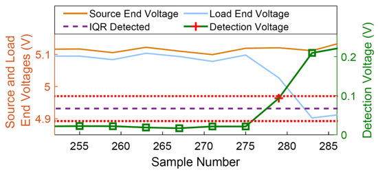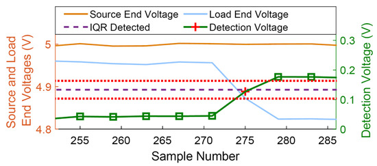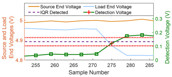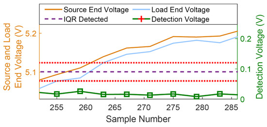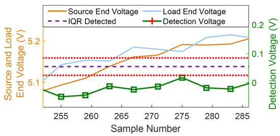 Consider the sharp load change event (Event 3) data shown in Section 4.1. A similar 7 ms intentional delay to the source end voltage data is introduced and the proposed series arc fault detection approach is tested. Figure 12 presents the fault detection analysis plot for this case. In Figure 12, it can be observed that the source end voltage measurement lags the load end voltage measurement due to the delay introduced. The source end voltage in this case is seen to be less than the load end voltage. This behavior plays to our advantage because it causes the detection voltage () to be below the region that finally detects the series arc fault (shown using dotted red lines). Hence, though a step change of 0.055 V (greater than ) was detected by the IQR calculations, the approach did not produce a false detection of a series arc fault.