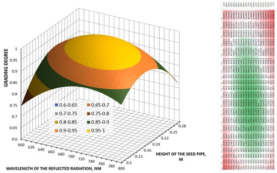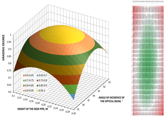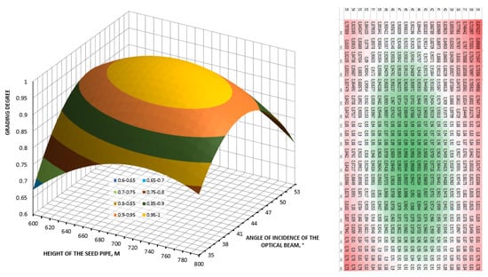 Interpretation of the obtained regression model determines that the maximum influence on the output value of grading quality is exerted by the angle of incidence of the detecting beam. This factor has the largest coefficients for both linear and quadratic variables. Next, in terms of the effect on the response (grading quality), there are paired combinations of the wavelength with the angle of incidence of the detecting beam and the wavelength with the height of the seed pipe, which have coefficients equal in absolute value. The minimum effect on the result is the wavelength of the optical beam. The coefficients of x1, x2, and x23 is positive, therefore, with the increase of the values of the factors, but not more than the plan—wavelength visible radiation and angle of incidence of the detecting optical beam, as well as the effect of pair interaction from a combination of the angle and height of the seed pipe—will increase the degree of separation in the visible range of wavelengths. The coefficients for x12, x13, x11, x22, x33 have a negative sign, so the response value will increase as these effects decrease.