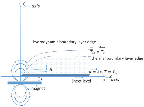 The boundary layer flows on the stretching sheet has been examined by many researchers for the rate of heat transfer and cooling as it has promising applications in many industries. The stretching sheet velocity of the flow field has gained considerable attention as it has a certain effect on the excellence of the final products in the fabric and polymer industry. This stretching velocity can be linear, polynomial, hyperbolic or exponential. The pioneering work of Crane [11] has laid the foundation for theoretical investigations on the flow field over a stretching surface. He presented an exact analytical solution of the flow over a linearly stretching sheet. The boundary layer heat transport flow of multiphase magnetic fluids past a stretching sheet under the impact of a circular magnetic field was described in [12]. The general fluid model for the magnetohydrodynamic fluid flow and heat transfer was analyzed by Hatzikonstantinou and Vafeas [13]. The authors computed heat transfer along with the skin friction coefficient in the flow of a micropolar fluid. In this direction, Papadopoulos et al. [14] demonstrated the theoretical investigation of pipe flow in the presence of a magnetic field in a ferrofluid along with a cylindrical coil. The available literature in this direction includes the study of ferrite nanoparticles [15,16,17,18,19].