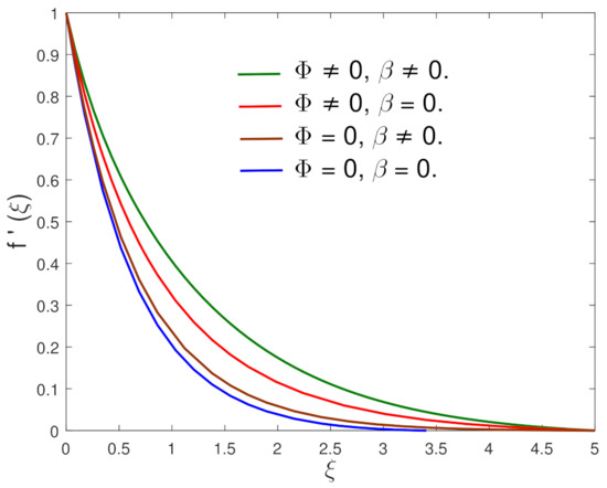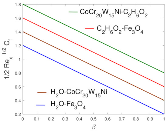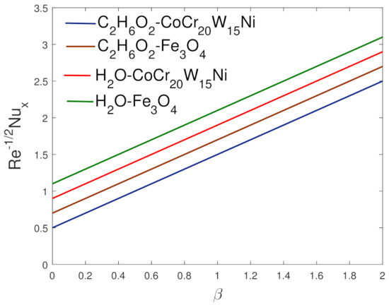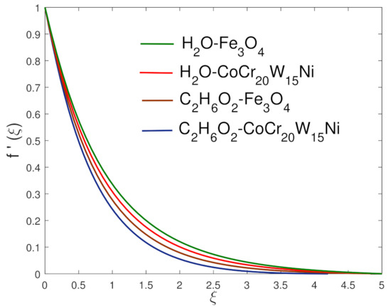 Generally, thermal engineers are interested in the reduction of wall shear stresses, whilst they need to enhance the heat transfer rate of the system. For this purpose, the mathematician constructs different mathematical models that interpret the heat transfer and the fluid flow to examine which model better predicts the friction drag and Nusselt number. Regular fluids have low thermal properties; thus, they are not fast in transmission of thermal energy, whereas solids have higher transport properties, and hence their dispersion in base fluids make them more efficient for heat transfer. Therefore, C2H6O2-Fe3O4, C2H6O2-CoCr20W15Ni, H2O-Fe3O4, and H2O-CoCr20W15Ni magnetic nanofluids were incorporated in this work. A higher resistance induced by the surface to the flowing fluid was noticed for the C2H6O2-CoCr20W15Ni magnetic fluid, which indicates that the alloy particles can cause more resistance as compared to the ferrite nanoparticles, as evident in Figure 6. The higher resistance has a better impact on the corresponding velocity. This means that the corresponding velocity will be higher for the considered solid particle and the base fluid. Figure 7 demonstrates the Nusselt number for the C2H6O2-Fe3O4, C2H6O2-CoCr20W15Ni, H2O-Fe3O4, and H2O-CoCr20W15Ni magnetic nanofluids. The maximum transmission of heat is observed for the H2O-Fe3O4 magnetic nanofluid. The thermal properties are higher for the base fluid as well as for the solid ferrite nanoparticles. Thus, the maximum heat transfer is noticed for the H2O-Fe3O4 magnetic nanofluid, while the temperature behavior is lowered. A comparison of the present results was made with the available results examined by Ishak et al. [30]. The comparison is made for the Nusselt number as presented in Table 3.