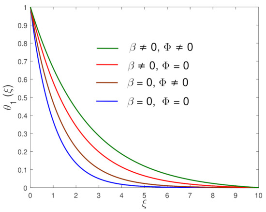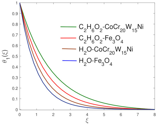 The influence of ferrohydrodynamic interaction parameter on the temperature and the axial velocity is displayed in Figure 4 and Figure 5. The magnetic property of the solid particles, i.e., alloys and ferrite, makes the two phase nanofluid magnetize in the presence of a magnetic dipole placed near the surface. The dipole attracts the alloy and the ferrite particles until the alloy and ferrite reach their Curie temperature. Thus, the axial velocity for varying declines, whereas the temperature profile for shows the reverse nature for all of the magnetic nanofluids C2H6O2-Fe3O4, C2H6O2-CoCr20W15Ni, H2O-Fe3O4, and H2O-CoCr20W15Ni. The impact of on the axial velocity is determined in Figure 4, whereas its influence on the temperature field is evident in Figure 5. The interaction between the nanoparticles of the ferrite and alloys with the flowing fluid leads to resisting the flow and the internal energy of the fluid. The higher resistance to the flowing fluid is induced by the alloy as well as the ferrite nanoparticles; as a result, the velocity field declines, as presented in Figure 4. On the other hand, the internal energy in the presence of the alloy and ferrite nanoparticles arises when is enhanced; thus, the temperature field enhancement is evident, as shown in Figure 5.
