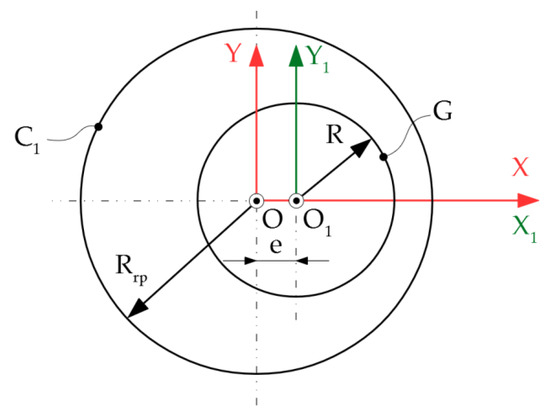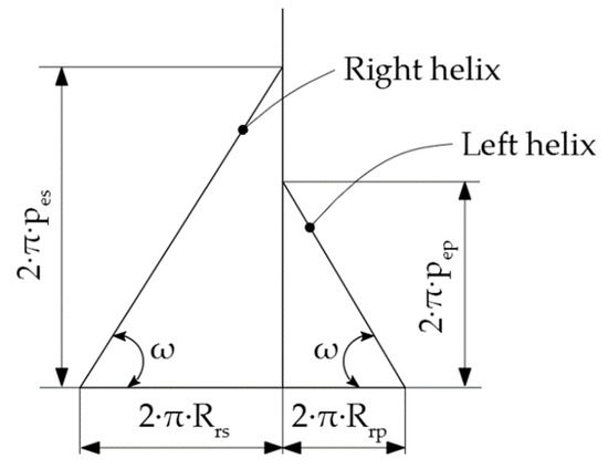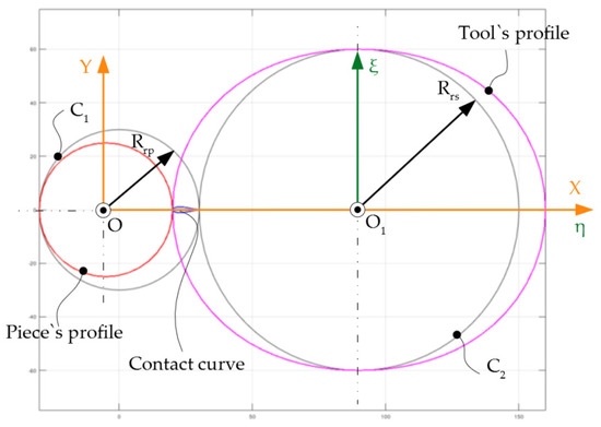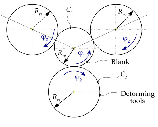 Figure 1 shows the two rolling centrodes: C1—the centrode of the blank, having the radius Rrp, and C2—the centrode of the tool of radius Rrs.