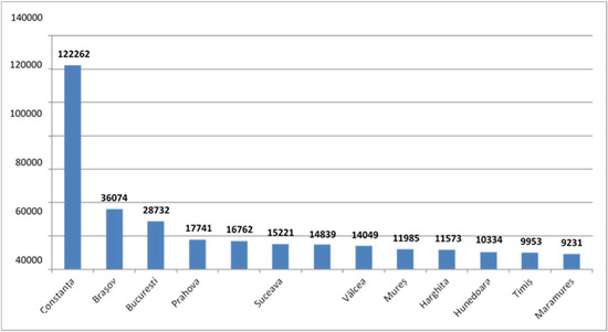 Number of tourist reception structures with accommodation functions, by county (December 2018). Source: http://turism.gov.ro/web/autorizare-turism/, accessed on 20 April 2021.
