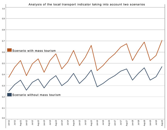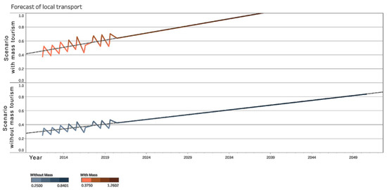 By projecting local transportation to 2050 (Figure 6), it is possible to see that, based on the current data introduced into the system, the mass tourism hypothesis is more beneficial, reaching an optimal around 2039, whereas the assumption without mass tourism reaches an optimal of 0.84 out of 1 at the level of 2050. The trend is clear in both scenarios, and the optimization of this activity is at the disposal of the authorities, who can take measures to stimulate this indicator.