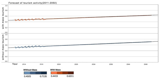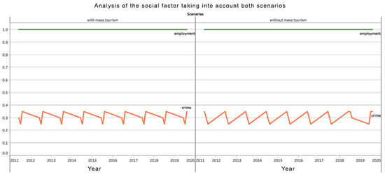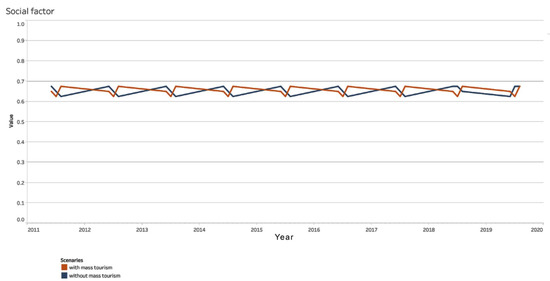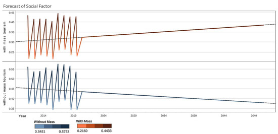 We conducted a similar analysis in terms of the social factor. If we focus on the intercalation of the two scenarios in the studied period, 2011–2019 (Figure 13), the situation becomes more interesting in terms of the forecasts of the two scenarios. The best option is also proven in the situation without mass tourism, with a higher value in 2050 than in the scenario with mass tourism. On the other hand, the trend is decreasing in terms of the option without mass tourism, while the trend is increasing in terms of the option with mass tourism (Figure 14). It is expected that in terms of community benefits, a choice will be made between the two options between 2050 and 2060. This social factor analysis provides some arguments for planners and public policymakers to choose one scenario over another based on the community’s development directions. Simultaneously, the analysis can be improved by including additional social indicators such as education, access to culture, health, and so on.