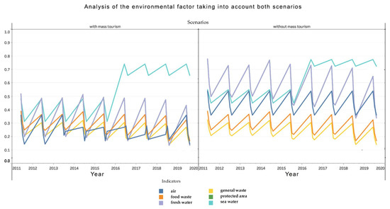 Similarly, we have expanded the analysis of economic factors (Figure 7 and Figure 8), social factors (Figure 9), and environmental factors (Figure 10) to account for the two scenarios, one with and one without mass tourism.