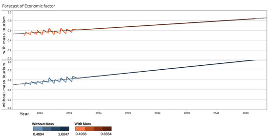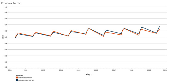 By achieving an average of the economic factor indicators (Figure 11) between 2011 and 2019, it can be seen that, while mass tourism was initially more beneficial, the situation changed in the middle of the period, and the activity without mass tourism became the better option for the community. A projection of this trend until 2050 (Figure 12) shows that both options are economically beneficial to the community, because the trend is growing; however, the growth in the option without mass tourism is more pronounced, reaching an optimal around 2048, whereas the optimal in the other option is expected after 2055.