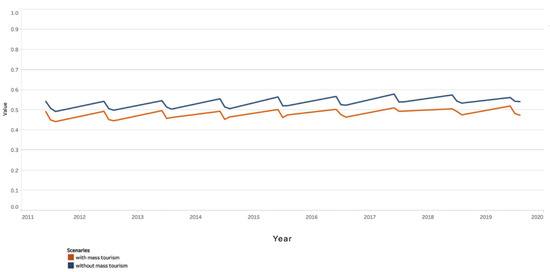 The final part of the analysis was completed by calculating the average of the two scenarios for all of the proposed factors (economic, social, and environmental). As shown in Figure 17, the scenario without mass tourism outperforms the scenario with mass tourism over the period 2011–2019. This demonstrates that the previous option was not the best fit for the community. Regarding the projections of the two scenarios until 2050, the trends in both situations are increasing (Figure 18). The scenario without mass tourism has faster growth, but the difference between the two scenarios is not significant. This situation presents a challenge for policymakers seeking to improve local policies in accordance with the path they wish to take for community development.