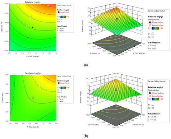 The b coefficients from the regression equation indicated that the temperature had a significant negative effect on betalain extractions. In addition, the interactions between temperature and temperature (C2) have significant negative effects, and quadratic citric acid concentration (A2) had a more negligible contribution. Furthermore, ethanol concentration (B) and extraction time (D) appreciably positively influenced the BT. The interaction between temperature and extraction time (AB) moderately affected the extraction, while citric acid concentration and ethanol concentration (AD) have a better effect.