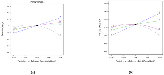 Graph of perturbations describing the effect of each independent variable (A, B, C, and D) on BT (a) and TPC (b) extraction.