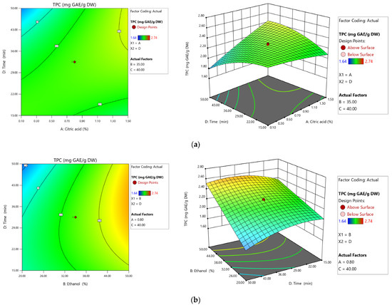 Second-order contour plots (left) and 3D surface plots (right) screening the effect of extraction time and citric acid concentration (a) and extraction time and ethanol (b) on the extraction yield of total phenolic content (TPC).