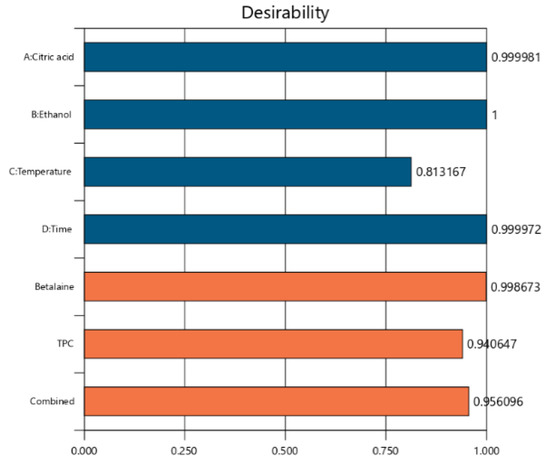 The phytochemicals extraction from plant materials relies upon the extraction strategy being influenced by the extraction parameters used. Moreover, the various polarities of compounds extracted by applying the experimental model could have an unpredictable impact on the extraction conditions. Hence, extractions were performed with extractants having various polarities controlled by adjustments in the water and ethanol. Adding ethanol to water may increase the betalain extraction yields [17], and the extracts can be easily used in biological systems. Moreover, the extraction optimization led to adding citric acid in the extraction mixture to acidify the medium, mainly because the betalains became stable at pH 3–7 [18].