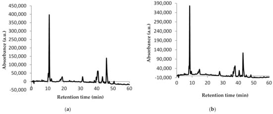 In order to characterize the carotenoid profile from the extracts obtained, the analysis of the chromatographic profile was performed by HPLC (Figure 2).