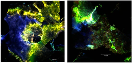 The biochemical complexity of the sea buckthorn fruits has been proven by numerous studies. The remarkable content of carotenoids (β-carotene, lycopene, lutein, zeaxanthin), vitamins (A, B, C, E, K), flavonoids (quercetin, kaempferol, catechin, isorhamnetin, etc.), and mono- and polyunsaturated fatty acids recommend this fruit as a food-medicine []. Depending on the variety, the climatic conditions, the time of harvest but also on the extraction method used, the proportion of biologically active compounds can differ considerably []. The confocal analysis of the two samples (Figure 3 and Figure 4) aimed at clarifying the morphological and structural aspect of the powders depending on the extraction method. For the excitation of the samples, the following lasers were used: Ar laser (458, 488, and 514 nm) and DPSS (561 nm pumped solid-state diodes) because the data from the literature indicate for the carotenoids’ absorption range the wavelengths of 448, 476, and 505 nm [,]. The studies by Llansola-Portoles et al. [], conducted on an in vitro carotenoid assembly, recommend the excitation at 532 nm to obtain the full set of transient absorption signals. The complex aggregates of carotenoids and flavonoids microencapsulated in the polymer matrices showed an autofluorescence in a fairly wide range 530–630 nm, and sometimes it could be observed that the spectrum shifts to red (685–750 nm) upon the aggregation [,]. The carbohydrate biopolymers that have been introduced into the microencapsulating matrices displayed the maximum absorbance between 300 and 400 nm which have been excited by the diode laser (405 nm).