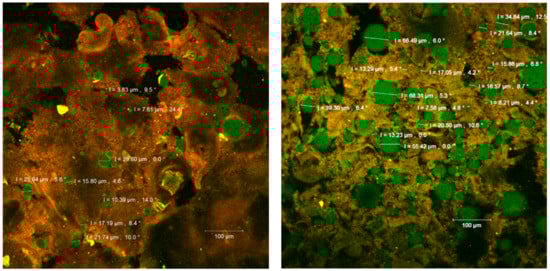 The confocal analysis of the samples after the fluorescent staining with Red Congo revealed the biologically active compounds from sea buckthorn fruit extracts in the form of spherosomes (in green) with different diameters between 3.83 and 215.78 µm. The Congo red dye binds the intact β-d-glucans from the biopolymer matrices [] as well as the peptides from the WPI, marking them in orange (Figure 4). Small spherosomes (<25 µm) are visualized in P1, while in P2 they are of medium size. P2 displayed a large number of spherosomes of medium size, well individualized, with a tendency to group in clusters and well stabilized in the WPI and CMC matrix. Similar results were previously obtained by Mihalcea et al. [], who use WPI and acacia gum as the encapsulation material, and by Neagu et al. [], who compared the native sea buckthorn extract with the cross-linked one mediated by transglutaminase.