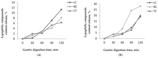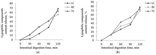 In simulated intestinal conditions, the results show that the maximum amount of lipophilic compounds is released during 120 min of digestion and are recorded for P2 (Figure 6). Thus, in P1 release, values of 55.59 ± 0.99%, 63.14 ± 1.3%, and 68.36 ± 0.62% were achieved for βC, TC, and LC, respectively, after 120 min (Figure 6a). P2 presented higher release values, i.e., 68.98 ± 0.41 % of the βC, 73.86 ± 1.03% of the TC, and 78.01 ± 0.91% of the LC released after 120 min of digestion (Figure 6b). Our results are in agreement with other studies. In research conducted by Neagu et al. [], a 10% release of the carotenoids in gastric juice was reported for the microencapsulated sea buckthorn extract in WPI and casein matrices. They also reported that, in simulated intestinal juice, the release increased significantly up to 65%.