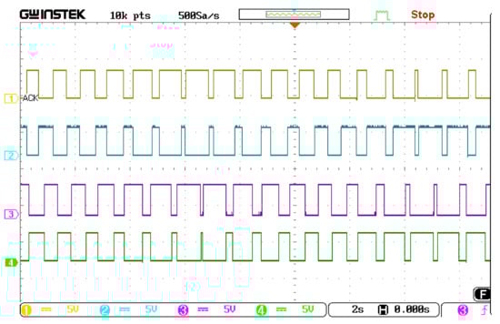 To test the encoder, it was first supplied by 5 V DC and the outputs of A, B, and an oscilloscope profiled z. Then, the motor was run at a certain speed, and the outputs were displayed. The A and B outputs had the same pulse width and frequency with a 90 degree shift.