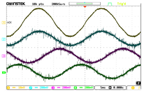 The outputs of the current transducers after applying a three-phase voltage to a three-phase resistance, (Cha-1) FLUKE current sensor on the first phase, (Cha-2, 3, 4) LEM current sensors to phase a, b, and c, respectively.