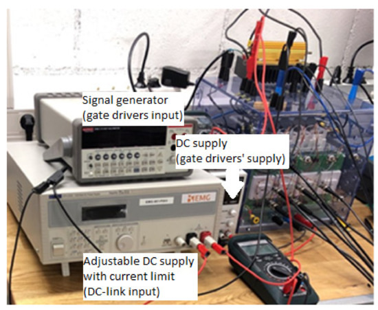 In this test, a DC supply was initially used to supply the gate drivers of the inverter. Then, a DC power supply was utilized to supply the DC link with a limited current range. Then, a function generator was applied to generate PWM signals to the input of the gate drivers. Finally, the outputs of the phase voltages were profiled using a scope to validate the setup’s performance. This test showed that the gate drivers were working with the 15 V logic of the PWM. To avoid any in-rush current, a resistor was connected in series with the DC link. Figure 8 shows the test bench for this test.