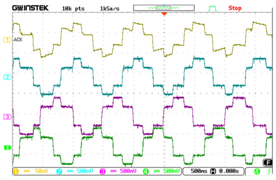 The device offered 32 digital inputs and outputs with the logic of 3.3 V and 5 V. The digital breakout board made all digital inputs and outputs accessible via terminal blocks and pin headers. Figure 1 shows a capture of the PWM signals designed with a 10 kHz carrier frequency for two sinusoidal signals. In addition, the signals were designed with 1 µs dead-time, meaning that for each fall and rise of the first signals, the inverted signal had a delay of 1 µs for rising or falling, respectively. This concept secured the operation of the IGBTs in each leg of the inverter. Therefore, with this concept, there were no longer two turned-on switches at the same time in one leg, and any short circuit in the inverter’s legs was avoided.