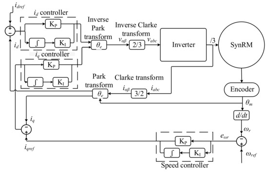 In this section, the simulation of the FOC of the SynRM is studied. For the sake of vector control of the motor, the d-q model of the motor was studied in [22]. This model of the motor was simulated in the Plecs platform. The parameters of the motor were measured by the DC decay test and utilized in the simulation. After modeling the motor, the FOC of the motor was implemented in the simulation, as illustrated in Figure 10. For this purpose, the output of the speed and the current inputs of the motor were utilized in the control process as feedback. With the flux position information from the motor’s model and the three-phase current feedback, it was feasible to transform the three-phase currents in the stationary reference frame to the synchronous reference frame using Park’s transform. By this, the motor was replicated as a DC motor with the correspondence of d-axis current to the flux in the motor and the q-axis current to the motor’s torque as the armature and field currents act in the DC motor.