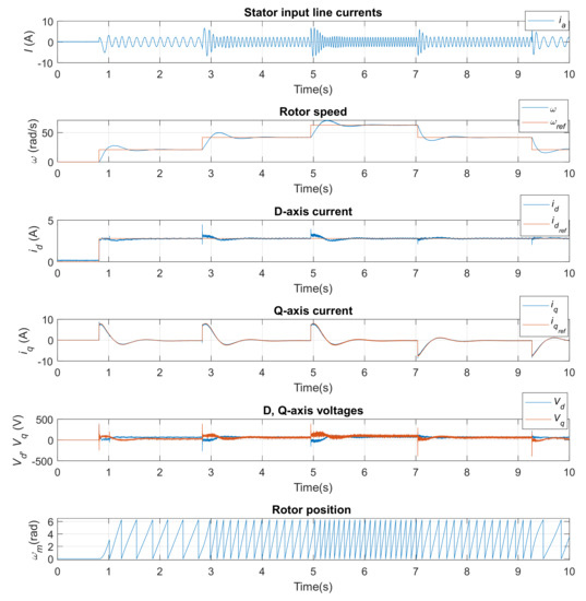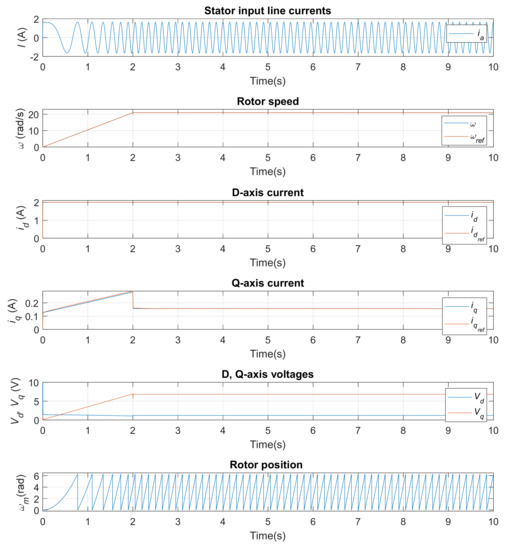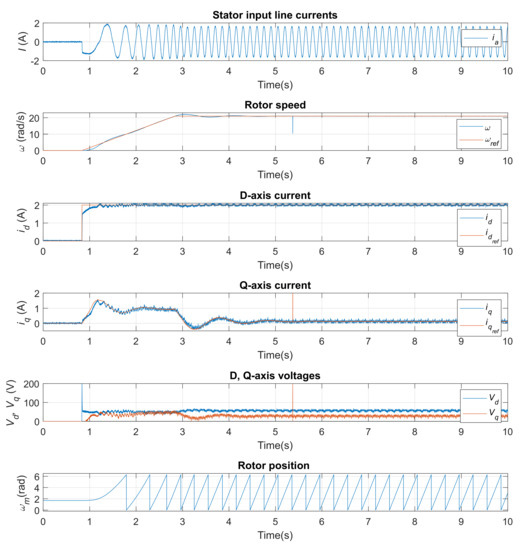 Where, id,q are the currents in the d and q axes, respectively and id,q ref indicate the reference currents in these axes. vabc represents the phase voltages and vα,β and vd,q are the voltages in the stationary and synchronous reference frame, respectively. θ indicates the position of the motor, which was synchronized with the flux position in this motor. In this simulation, the current reference of the d-axis was a constant value. Using a proportional-integral (PI) controller, the q-axis current was generated by regulating the speed error between the reference speed with the instantaneous speed utilizing a proportional-integral (PI) controller. After generating the errors of the d and q-axes currents by comparing the reference values to the actual values, two PI controllers were employed to regulate the errors and amplify them to generate the d and q-axes’ voltages in the synchronous reference frame. Then, the generated voltages were transformed to the three-phase stationary reference frame using the inverse Park transform. Finally, the generated voltages were applied as PWM signals to a model of a three-phase inverter, and the command voltages were applied to the motor’s model. In this way, the control was carried out in simulation. Figure 11 shows the results of the simulation of the FOC of SynRM.