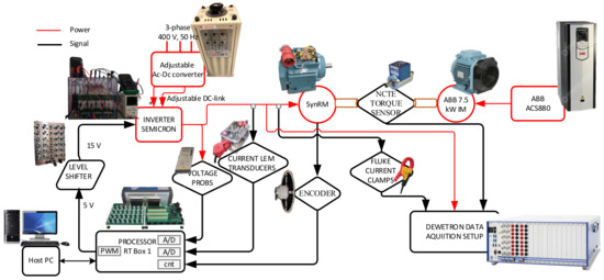 Motor-drive systems have the most significant share in industrial energy consumption, which requires a deep study in every aspect of the field. This paper presents a synchronous reluctance motor (SynRM) drive system based on Plecs RT box 1. The system’s design provides the opportunity for the open-loop and closed-loop control of the motor and a characteristic performance analysis of the motor. This paper focuses on the hardware implementation of a research laboratory setup and the precise vector control of the SynRM in real-time. The application of the digital controller and inverter to drive SynRM is examined. The voltage, current, and speed transducers were employed for monitoring the protective measures and to control the motor in the closed-loop. The design of the signal conditioning and the intermediary cards for isolation and data acquisition are described in detail. An algorithm is proposed to measure the whole system parameters, including motor, inverter, and cables. Thanks to the RT box 1, the principle of real-time simulation of control algorithms is investigated, and the rapid control prototyping of field-oriented control (FOC) of SynRM was implemented. The simulation of the system was carried out in the Plecs platform, and the results are presented. The experimental results of the implemented control algorithms validate the setup’s performance and the control algorithm. Finally, as a study of the motor’s performance, the efficiency map of the motor is drawn in different speed and torque ranges.