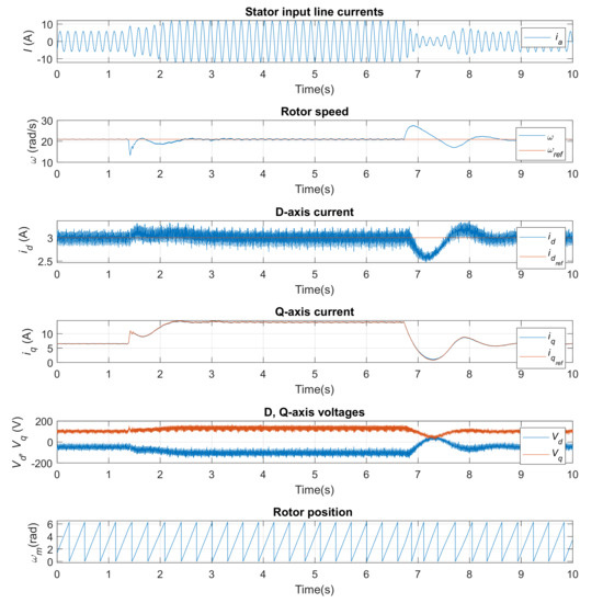 The second test that was projected to analyze the performance of the control imposed a step load to the motor and removed the load after reaching the steady-state. For this purpose, the loading motor was coupled to the motor under test. An industrial frequency converter drove the loading motor in the opposite direction. It should be noted that the loading motor was controlled in torque control mode to just inject the reference torque regardless of the output speed. In this way, the loading motor was driven in generator mode since the load and the speed were in opposite directions. By starting the loading motor, a step load of 10% of the nominal torque of the motor was imposed on the motor. To avoid the motor running in the generator mode, a safety algorithm was devised to monitor the DC link of the inverter and the speed and current of the motor. This algorithm was devised to switch off the PWM block in case limits that were defined were passed. After imposing the load with the loading motor, the motor speed was anticipated to drop for a short while and reach the reference value in the steady-state. In the phase of removing the load, the motor speed was projected to have an overshoot for a short while and follow the reference speed in the steady-state. Figure 16 shows the results of the experimental test. The results show that the motor current increased under load to increase the input power of the motor to dominate the load on the motor shaft. As can be seen, the d-axis current, which corresponded to the flux, remained nearly constant, and the increase in the current was due to an increase in the q-axis current, which corresponded to the torque. As a consequence, the motor generated more torque on the shaft in the opposite direction with the loading motor. Thus, the speed recovered after a small portion of time and followed the reference speed. The voltage in q-axis increased in the loading condition, and the d-axis current dropped negligibly. As can be seen, all the parameters settled down to their initial values after the load was removed.