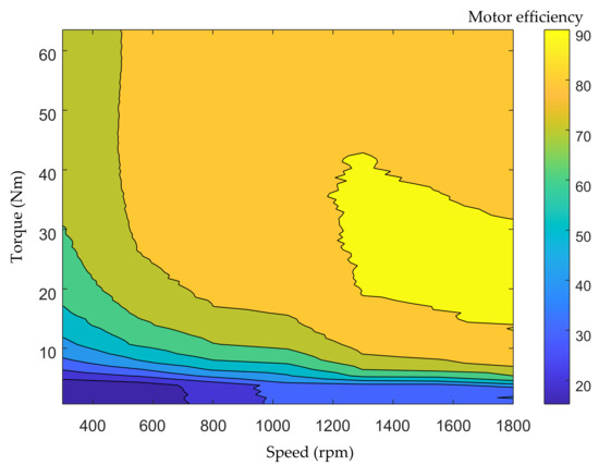 One of the objectives of this study was to analyze the designed motor’s performance characteristics. The motor efficiency at different speeds and under different load conditions was studied. The test was designed to run the motor at different speeds with the step of 200 rpm up to 1800 rpm, which was over the nominal speed of the motor. Then, a ramp load was designed using the industrial frequency converter to ramp up to the nominal torque and impose on the motor. Fluke current clamp meters and Dewetron data acquisition setup measured the motor’s input currents and voltages. As well as the inputs, the motor’s outputs were sensed using a NCTE torque transducer and registered by the Dewetron data acquisition setup. The power analyzer in Oxygen software was employed to calculate the input power of the motor as well as the output power. Finally, the efficiency of the motor was calculated at different speeds and torques. Figure 18 shows the efficiency map of the motor. The figure shows that the motor presented a big range of high efficiency of around 90% in the nominal speed range and the middle of the nominal torque. A vast region of a nearly high efficiency of 80% was registered in the speeds higher than 500 rpm and torques higher than 15 Nm. This shows that the motor can work in a wide range of speeds and torques with high efficiency. As it was expected for most of the motors, when it came to low speeds, the motor’s efficiency dropped to a low value. This was true for the low torques, which required the engineers to opt for the motors regarding the applications in the right power range.