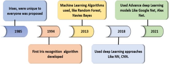 Since 2013, machine learning (ML) technology has been widely used in ILD research. The ability of ML to classify and forecast is a significant reason for employing these algorithms. ILD employs various algorithms, including logistic regression, SVM, Ad Boost, and Random Forest. Figure 1 displays the timeline of iris biometric authentication (fingercheck.com (accessed on 4 August 2021)) highlights some of the most pivotal historical moments in the development of itis biometrics. Deep learning (DL) algorithms are used to process enormous amounts of information. With the introduction of deep learning approaches for iris liveness detection, the researchers began using deep Learning technology.