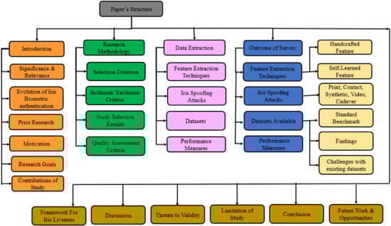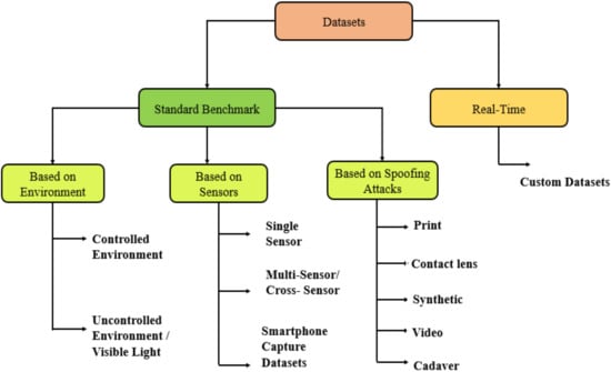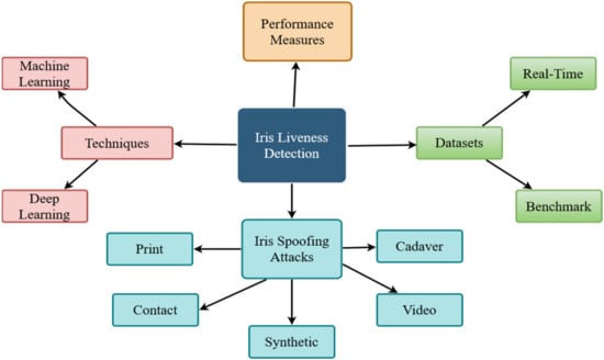 The existing literature on ILD focuses on hardware and software trends, and different classification techniques using ML-based and DL-based approaches []. It is indispensable to have a “comparative analysis of these techniques based on” numerous evaluation metrics. It is obligatory to work out the relevant papers and academic works methodically to recognize what research has been steered concerning biometric and ILD []. This survey aims to shed light on a variety of datasets, performances measures used, iris spoofing attacks, and techniques used for detection of iris liveness.