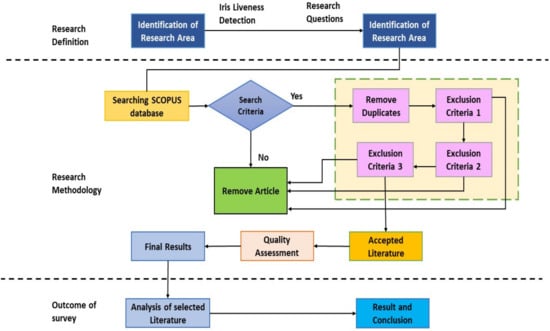 It was perceived that different digital libraries recurrently gave back those numerous papers through carrying out introductory searches. After bearing in mind this fact, we decided to use only Scopus, ACM, and Web of Sciences databases. The search was conducted on 28 June 2021 between January 2010 and June 2021 in the Scopus and Web of Sciences. The search query was defined by using different keywords related to the iris biometric liveness detection system using the iris identity in the following way: