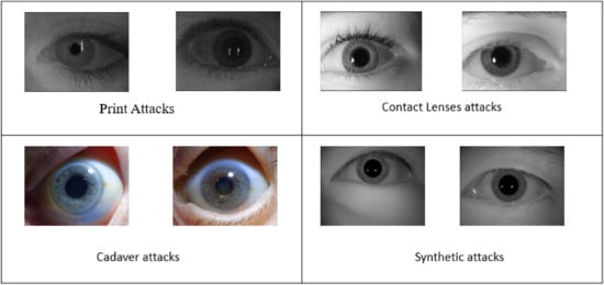 - Gupta, P.; Behera, S.; Vatsa, M.; Singh, R.; Gupta, P.; Behera, S.; Singh, R. On Iris Spoofing Using Print Attack. In Proceedings of the 22nd International Conference on Pattern Recognition, Stockholm, Sweden, 24–28 August 2014; pp. 1681–1686. [Google Scholar] [CrossRef]